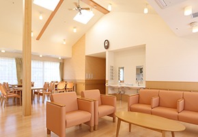 伊吹山の麓に位置した当施設は、温もりのある木をふんだんに使った木造平屋建てで、広くて開放的な吹き抜けリビングや憩いのスペース、中庭を設け、利用者がどこにいても心地よさを感じられる、そんな施設です。