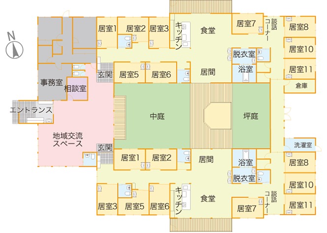 また、全館バリアフリーはもちろん、床には利用者が万が一転倒した際にも衝撃を和らげる二重床を採用するなど、安全面にも配慮しています。